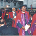 - Professor Wynter, looking at camera, in UWI Mona’s 1995 graduation ceremony