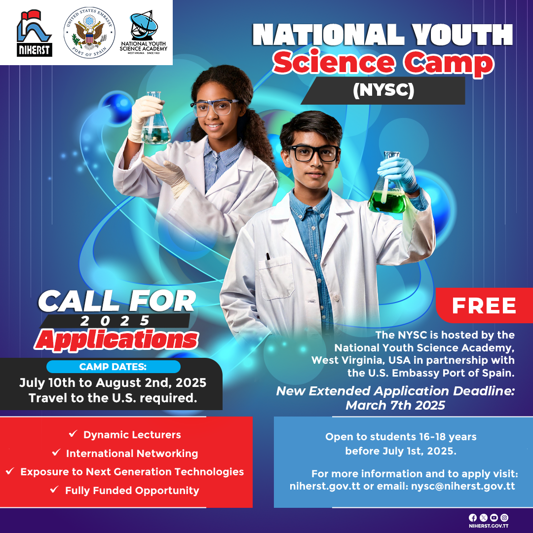 National Youth Science Camp | The National Youth Science Academy (NYSAcademy) has traditionally offered a residential science education programme, called the NYSCamp that honors and challenges 2 talented and promising STEAM [Science, Technology, Engineering, Arts, and Mathematics] high school students from each state in the United States of America and others, from selected countries around the world, including Trinidad and Tobago. Representatives of the NYSCamp will be provided with opportunities to engage with STEAM professionals and participate in exciting outdoor activities. → World-class lectures, directed studies, seminars, and meaningful fun Learn more at www.nyscamp.org |